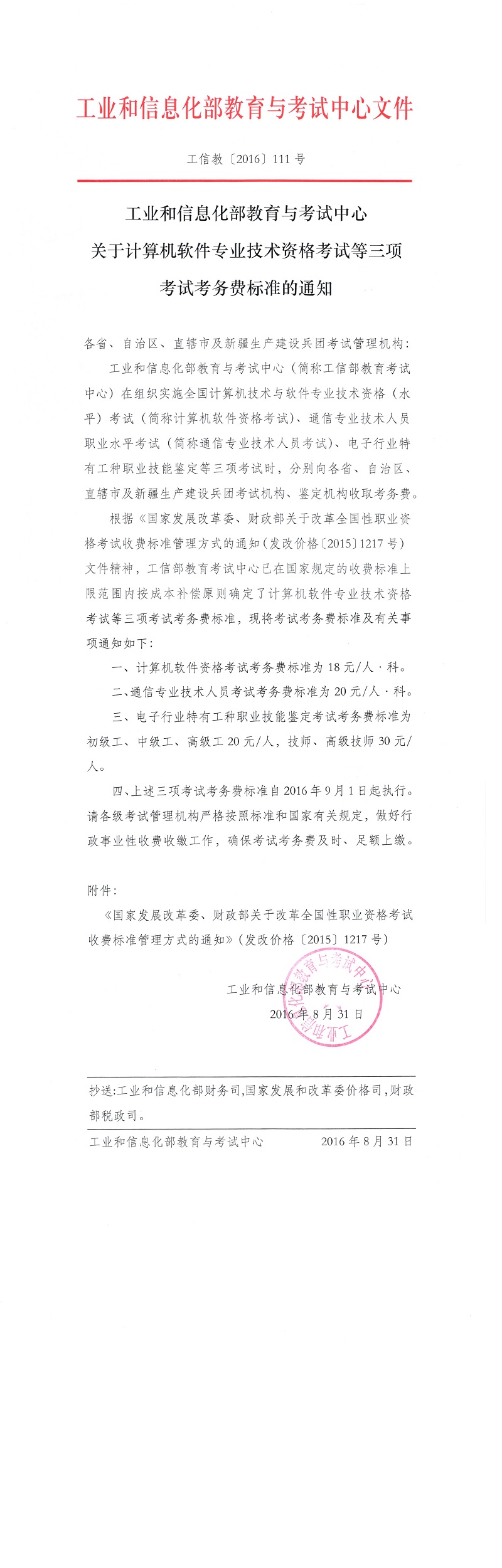 工業和信息化部教育與考試中心關于計算機軟件專業技術資格考試等三項考試考務費標準的通知